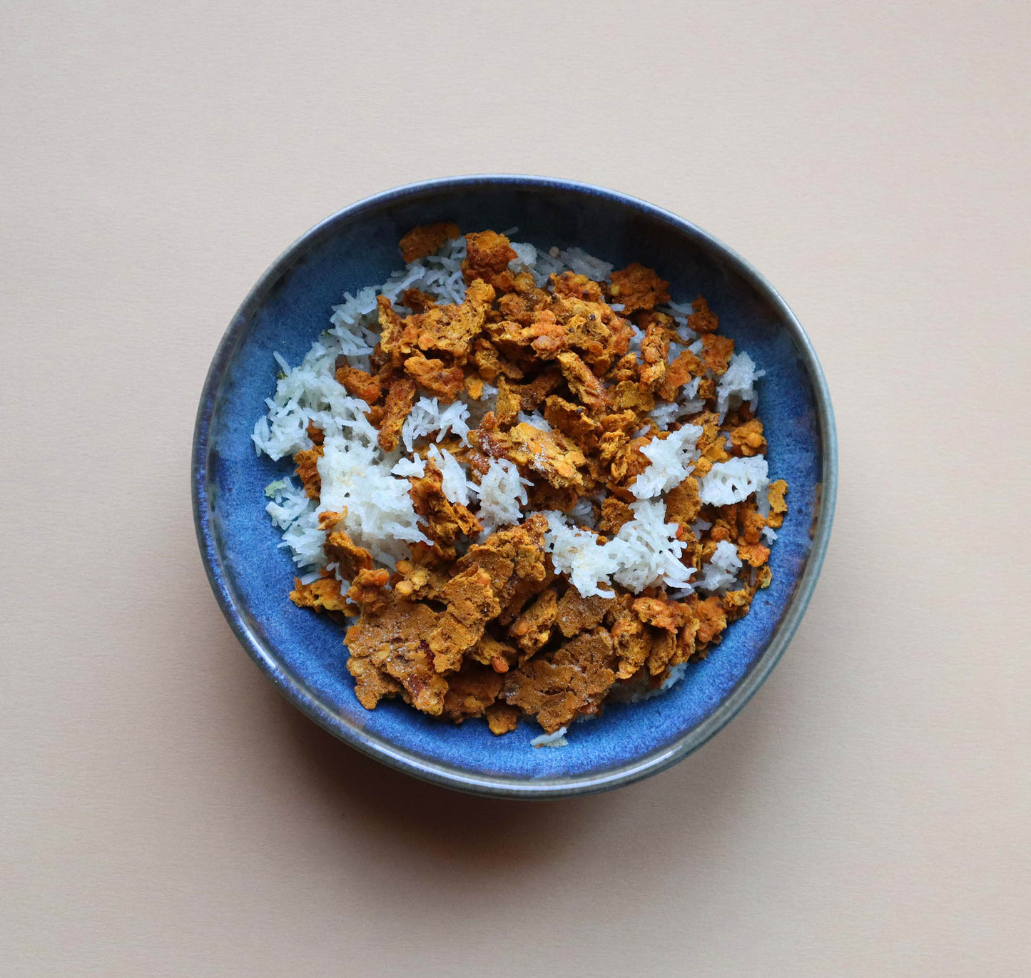 Ingrédients: Lentilles rouges (EU), riz, tomates concassées, oignon, concentré de tomate, jus de citron, lait de coco en poudre(Pulpe de coco* (Sri Lanka ou Philippines) dégraissée partiellement 50%, sirop de riz* déshydraté, farine de riz*, fibre d'acacia*, nectar de fleur de coco*), huile de coco, ail, épices, sel, moutarde graine, coriandre feuille. *biologique, ** sans gluten