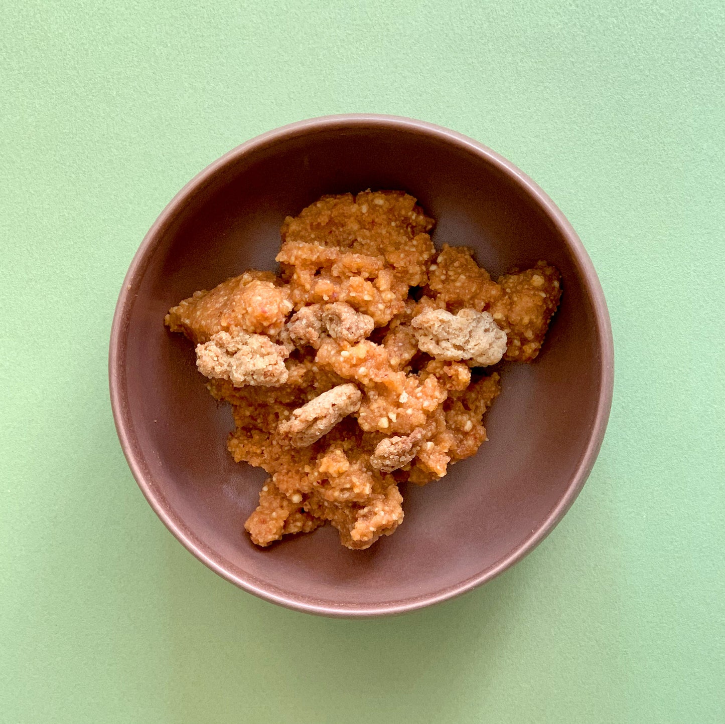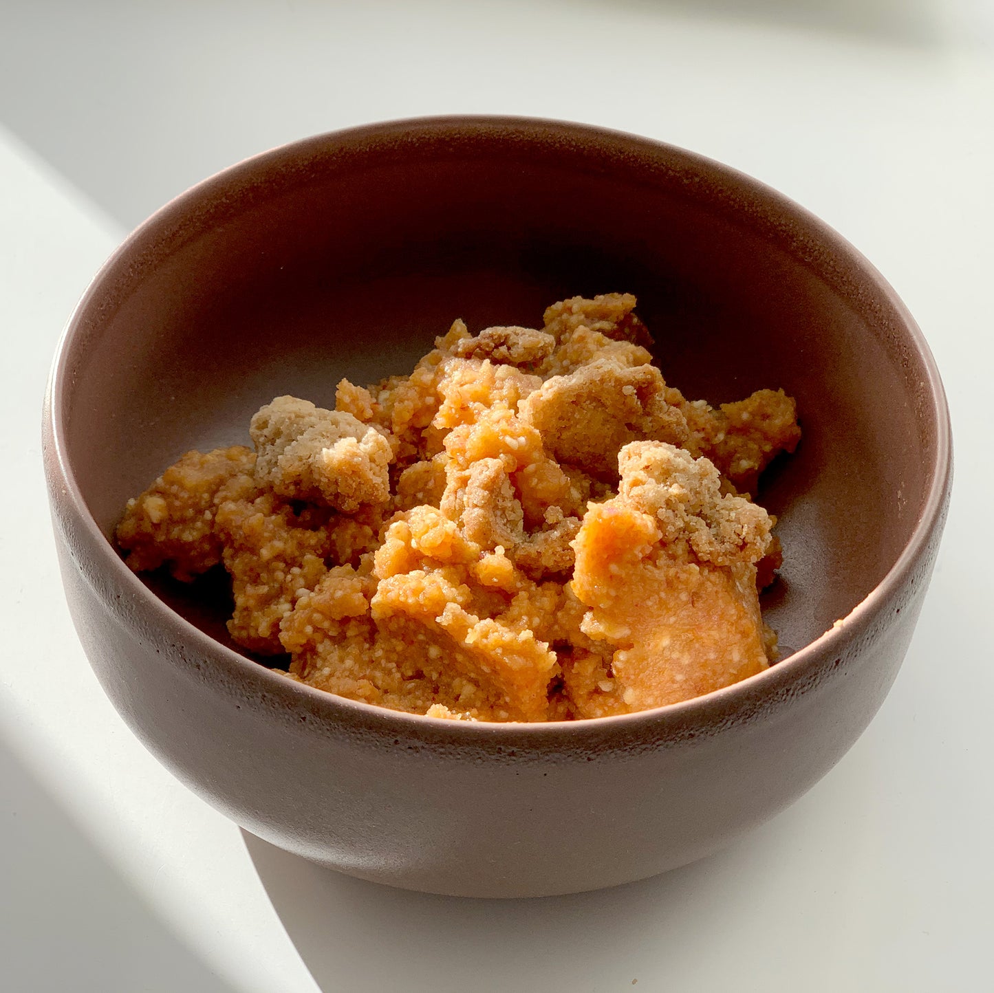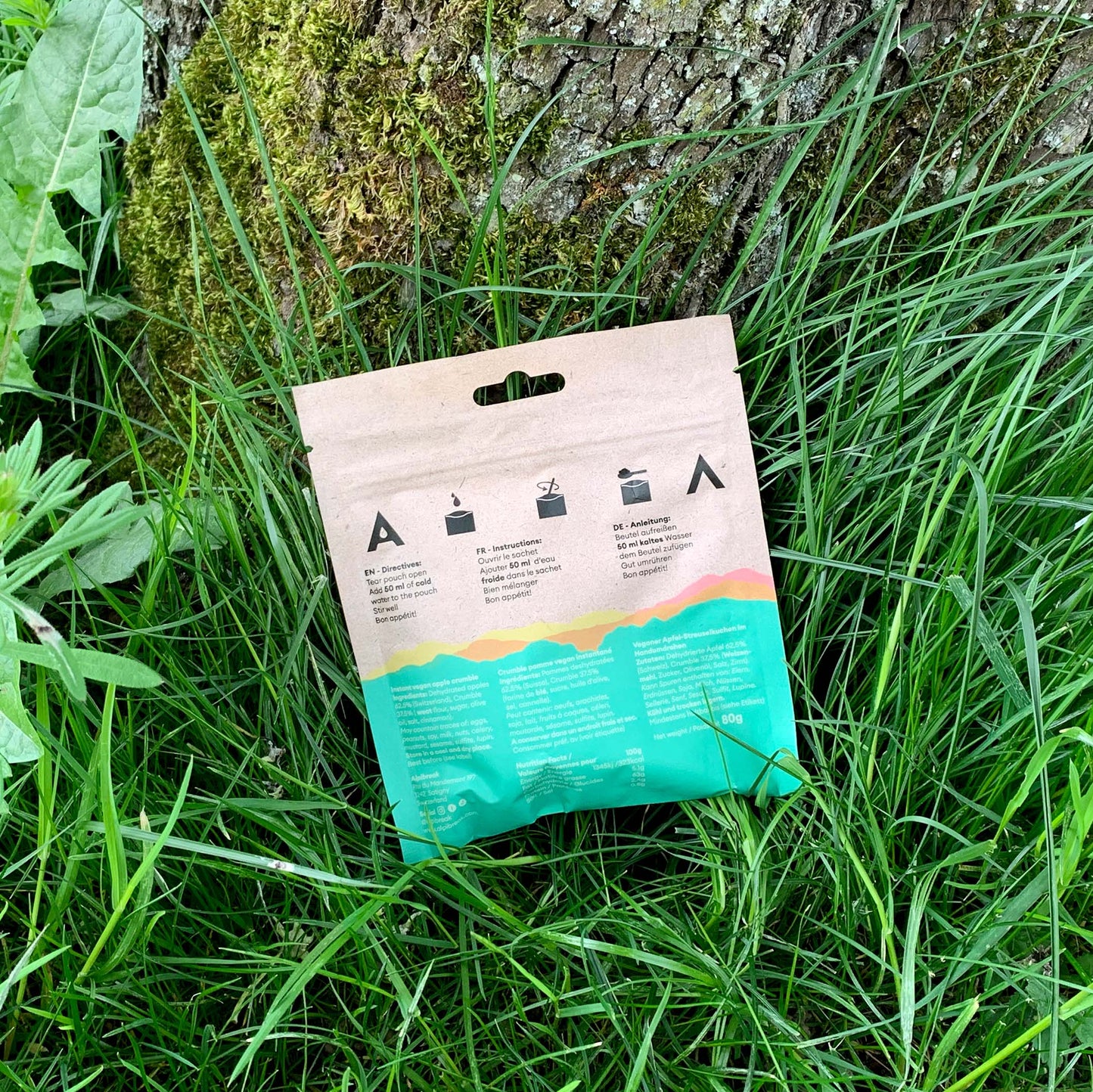 Ingrédients: Pommes déshydratées 62.5% ( Suisse) , crumble 37.5% ( farine de blé, sucre, huile d'olive, sel, cannelle).